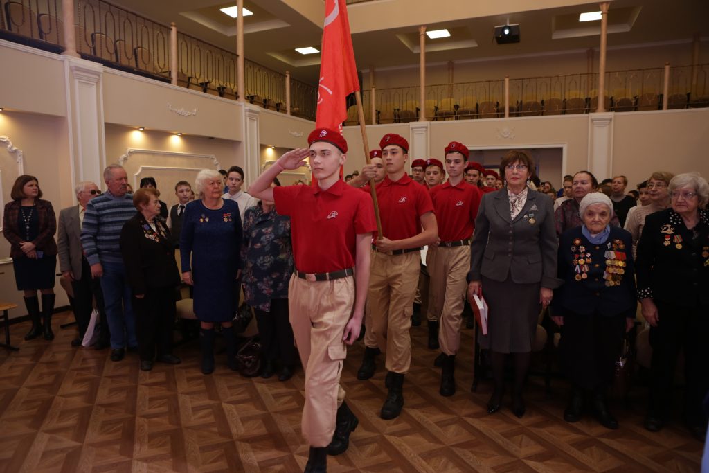 Мероприятие началось с торжественного вноса в зал главного символа победы – красного знамени, хранящегося в совете ветеранов округа. Этот священный атрибут сопровождает все памятные митинги, посвященные Великой отечественной войне, и передается из школы в школу.