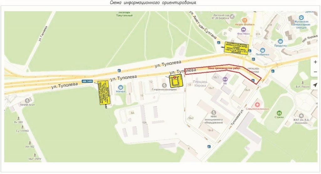 Движение автомобильного транспорта на указанном участке ул. Туполева в сторону г.Раменское будет осуществляться по временной схеме в объезд через ул. 2-я Кирова (НИИ АО). Схема движения автомобильного транспорта из г.Раменское остается без изменений.