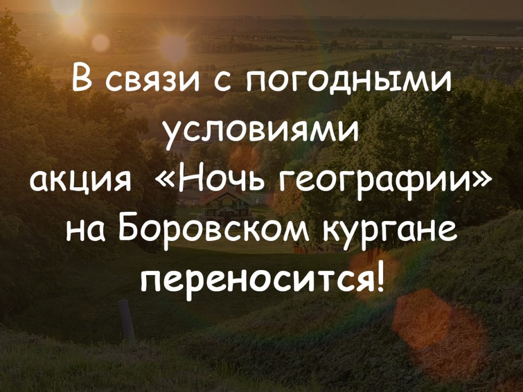 ??Боровской курган в Чулково – настоящее место силы, и мы хотим, чтобы в этом году вы снова это почувствовали. Но мы боимся, что погода, ожидаемая завтра, может помешать вам насладиться акцией в полной мере. Поэтому организаторами было принято решение перенести мероприятие в связи с погодными условиями.