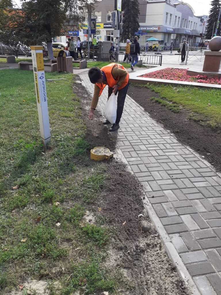 Дополнительно сотрудники разровняли по краям нового тротуара землю и засеяли газон.