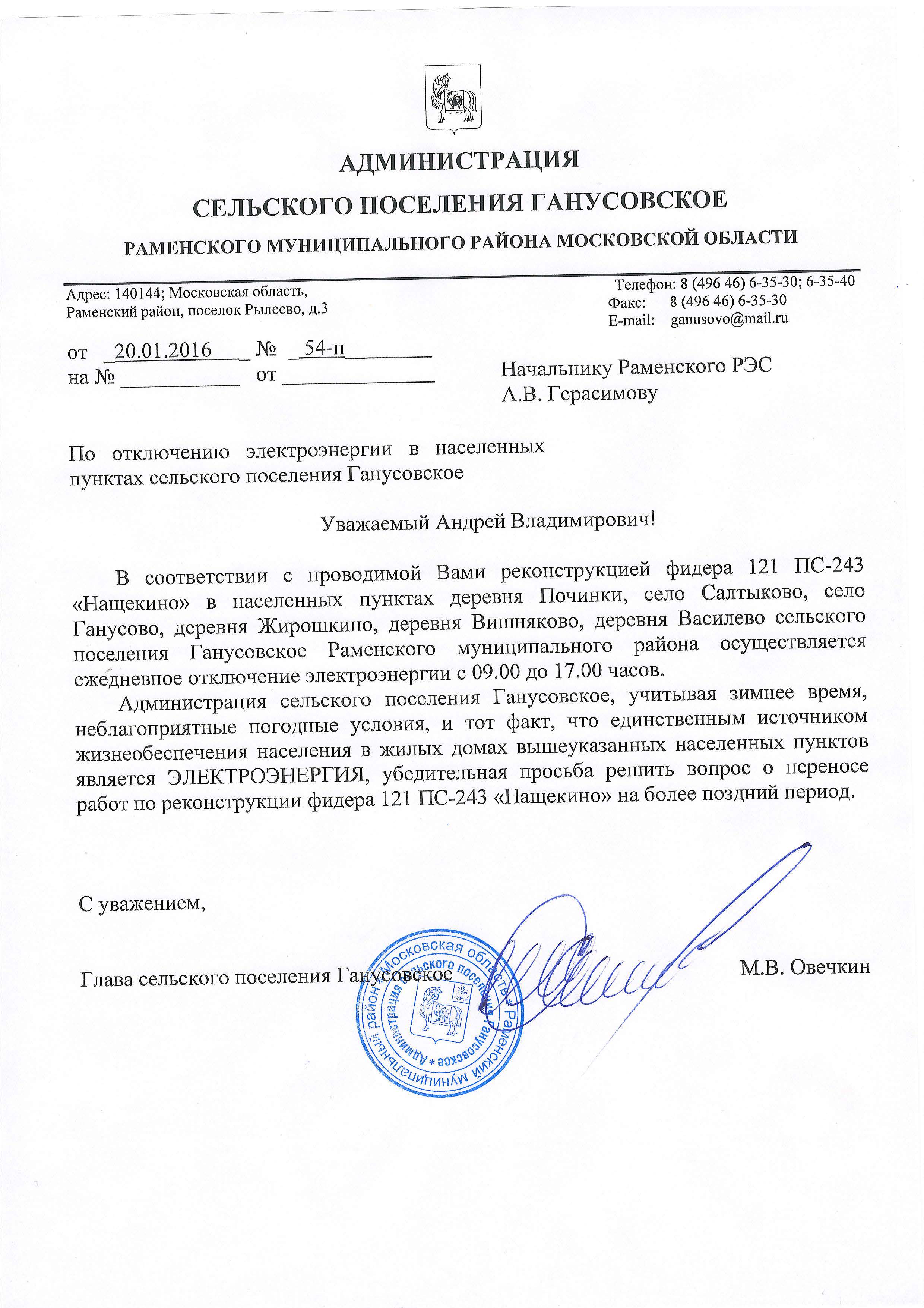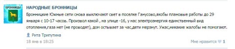 — Электросетевые компании администрациям поселений не подчиняются, более того, с 1 января 2015 года администрации сельских поселений утратили полномочия в сфере теплоснабжения, водоснабжения, электроснабжения. газоснабжения и т.д. На основании 136-ФЗ… за поселениями стабильно остались обязанности по наружному освещению. Вчера, 20 января состоялась личная встреча с директором Раменского РЭС Герасимовым А.В. по нашему письму о переносе работ на более поздний и благоприятный период… Он заверил, что уже сегодня будет обсуждать эту проблему со своим руководством. С Андреем Владимировичем в контакте и ждем решения. С жителями на контакте, только вчера был личный телефонный разговор с представителями села Ганусово и деревни Жирошкино (со многими старостами и активистами на прямой мобильной связи).