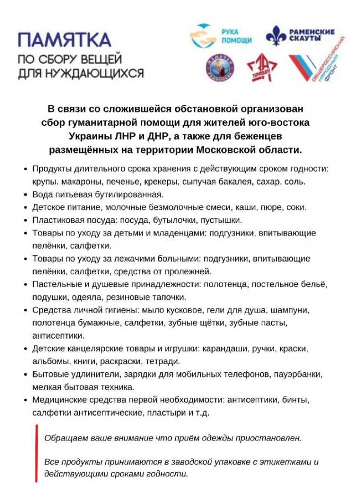 Прием одежды приостановлен. Основной акцент сейчас на сбор продуктовой помощи, средств личной гигиены, детского питания, средств для ухода за детьми.