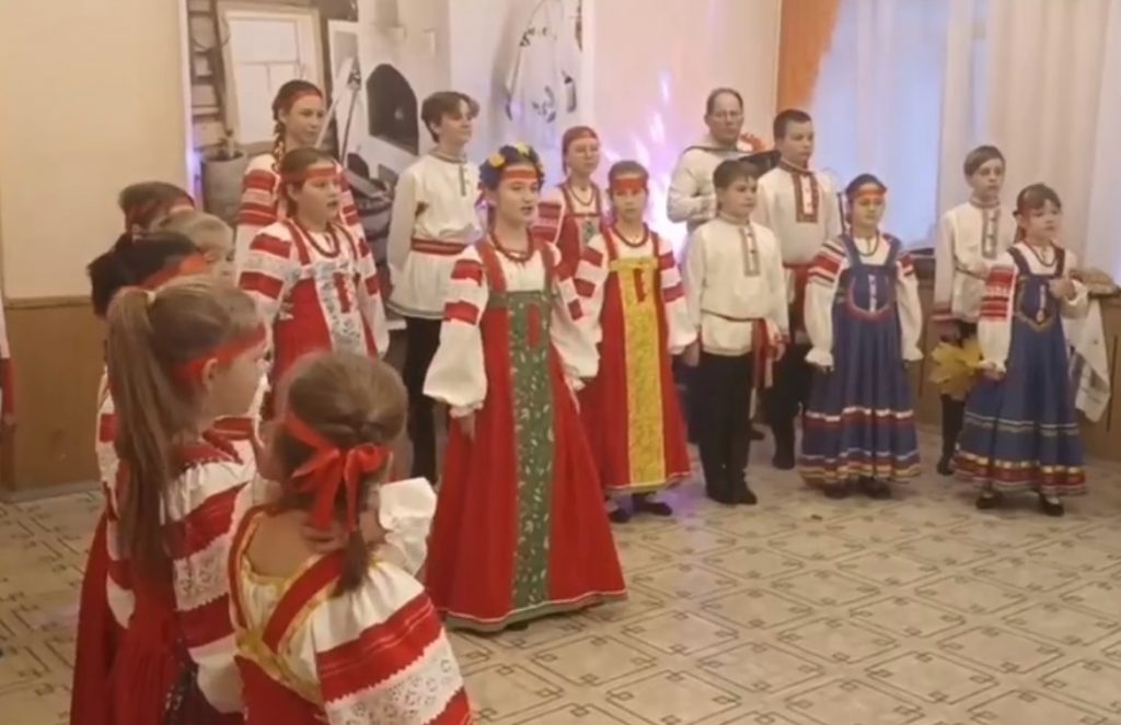 Артисты в народных костюмах: красные атласные ленты в волосах у девочек, нарядные косоворотки у мальчиков и весь праздник в сопровождении баяна, звучали русские песни, впечатляет многоголосье. А ещё и каравай на рушнике и, конечно, старинные забавы.