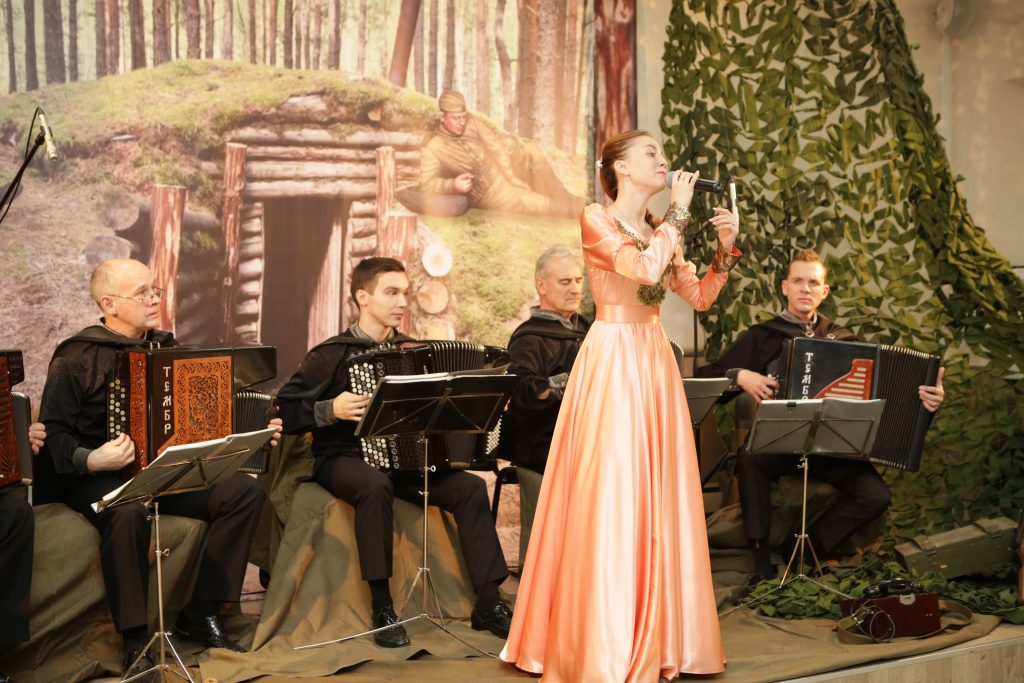 Перед началом концерта в фойе под музыку военных лет в исполнении ансамбля «Русский тембр» прошла фотовыставка «Помню! Горжусь!».