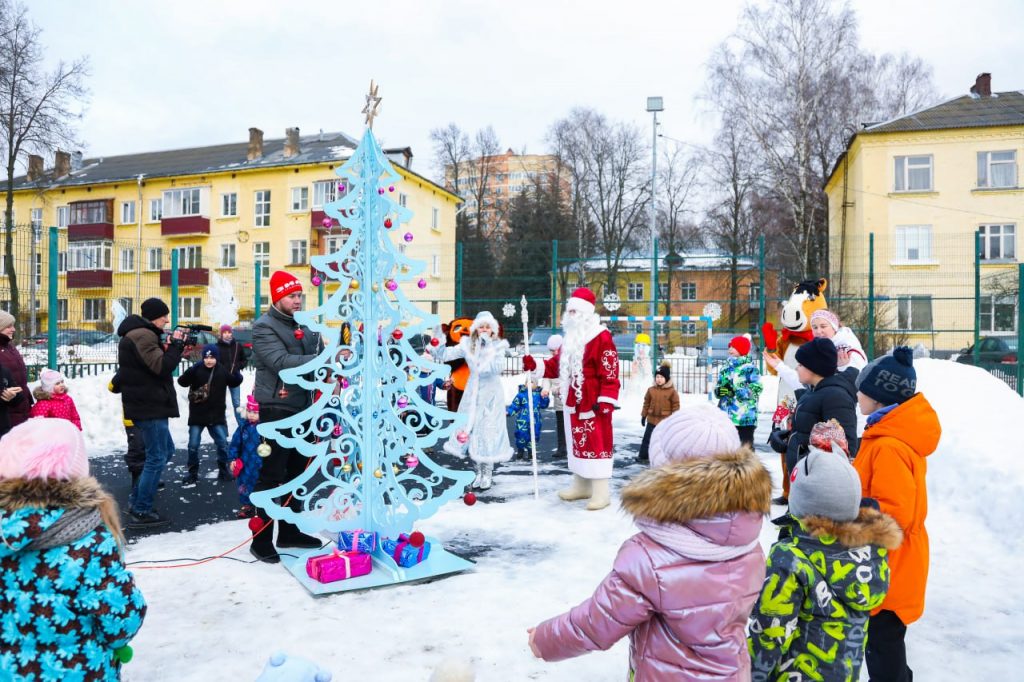 Жители все вместе украшали площадку к празднику. В хоккейной коробке установили необычную елку, выпиленная вручную по эскизам председателя совета дома Елены Волочковой.