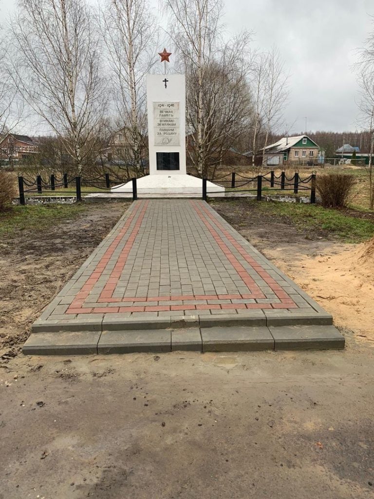 Несмотря на период самоизоляции, полным ходом идут ремонтные работы обелисков в деревнях Трошково, Глебово. Закончена укладка тротуарной плитки.