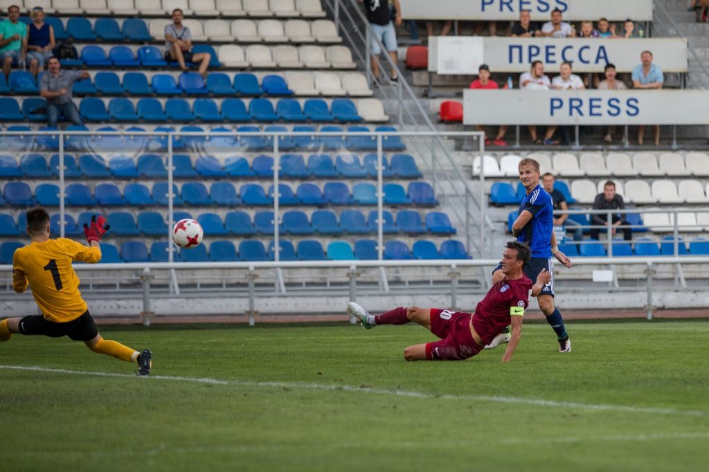 После матча в Рязани в наш состав вернулись выздоровевший Никитинский и отбывший дисквалификацию Бор. Также произошла смена вратаря. Уже на десятой минуте матча случился форс-мажор, и получивший повреждение Королев уступил место на поле Манюкову. А вскоре возник первый голевой момент, который не реализовал Корж. Мяч остановили голкипер и штанга, зато следующий шанс использовал расстрелявший ворота ударом с полулета Никитинский — 1:0.