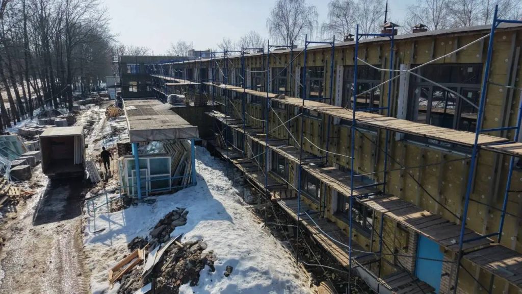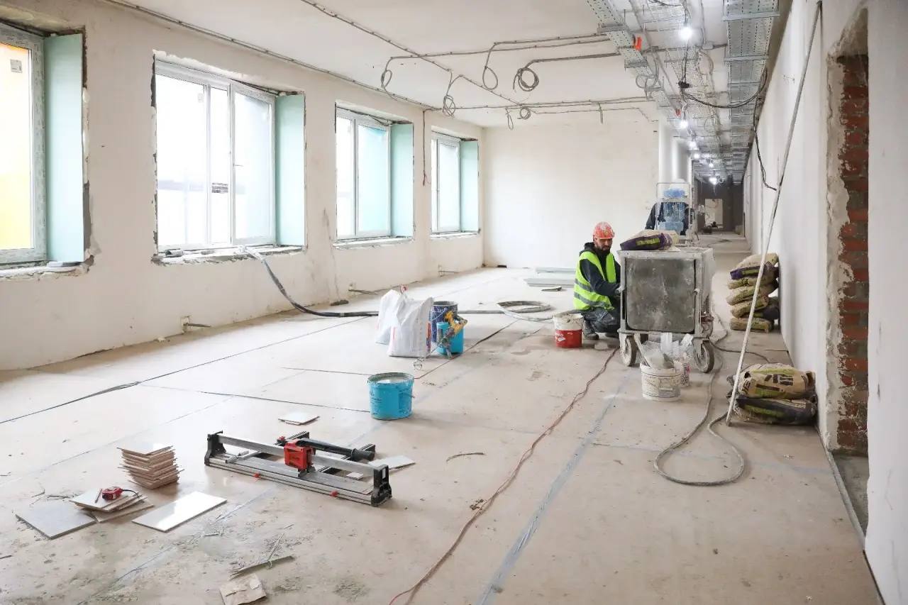 На данный момент уже выполнены демонтажные работы и усиление проёмов. В активной стадии находятся установка навесного вентилируемого фасада, отделочные работы, прокладка инженерных сетей: отопления, водоснабжения, вентиляции, кондиционирования, электроснабжения и слаботочных систем. В ближайшее время подрядчик приступит к благоустройству прилегающей территории и монтажу новой кровли.