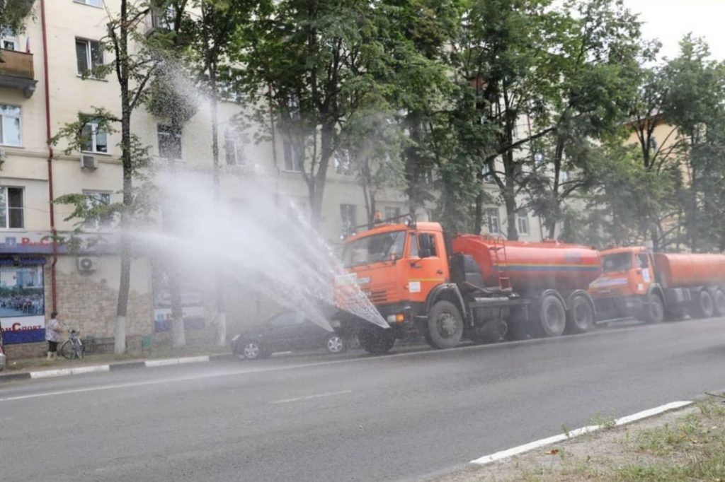 Полив дорог в летние месяцы проводится постоянно, но когда температура на столбике термометров начинает подниматься выше 25С, к проливу дороги добавляется и аэрация воздуха – струи воды поливомоечной техники направляются вверх, таким образом они охлаждают не только дорожное полотно, но и воздух, который нагревается от асфальта. Это необходимо для того, чтобы охладить дорогу, так как из-за сильного нагрева полотно становится мягким, что приводит к образованию калейности и выбоин. Сейчас цикличность полива и аэрации составляет 3 часа, на дорогах в городе работает 8 единиц техники. Дорожники проливают не только центральные улицы, но и внутридворовые территории.