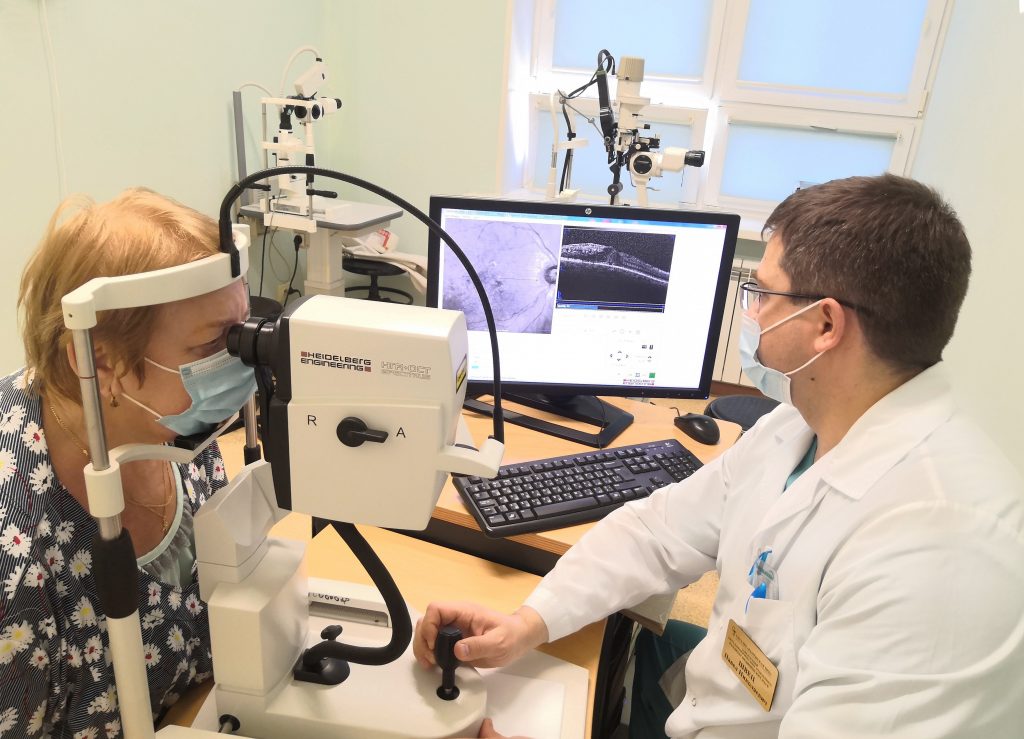 «В результате исследований выявили тромбоз нижне-височной ветви центральной вены сетчатки, вследствие которого начал развиваться макулярный отек. Увеличивалась толщина сетчатки, образующиеся в ней полости угнетали работу фоторецепторов, снижая остроту зрения. Врачами офтальмологического отделения была применена современная технология по введению в стекловидное тело глаза лекарства пролонгированного действия. Имплантированный препарат отличается выраженным противовоспалительным и противоотечным действием. Он будет постепенно в течение полугода «растворяться» непосредственно у очага тромбоза», — рассказал заведующий офтальмологическим отделением Павел Швец.