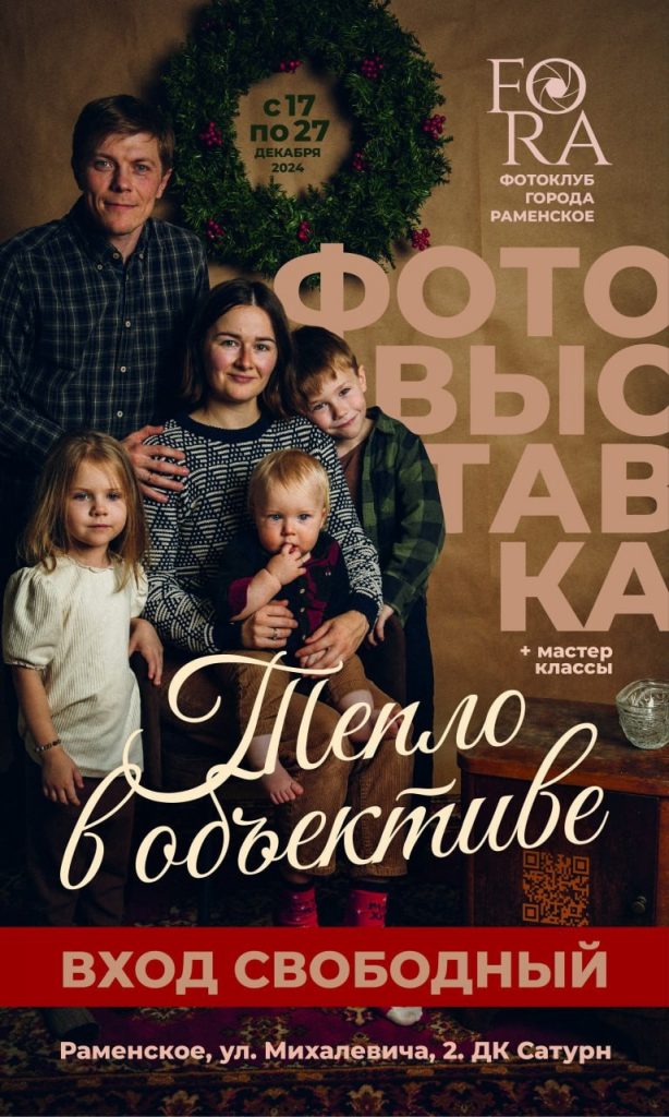 Фотовыставка объединит работы любителей и профессионалов из фотоклуба Раменского округа. Участники коллектива, основанного в 2021 году, продемонстрируют самые теплые семейные моменты и взаимоотношения разных поколений.