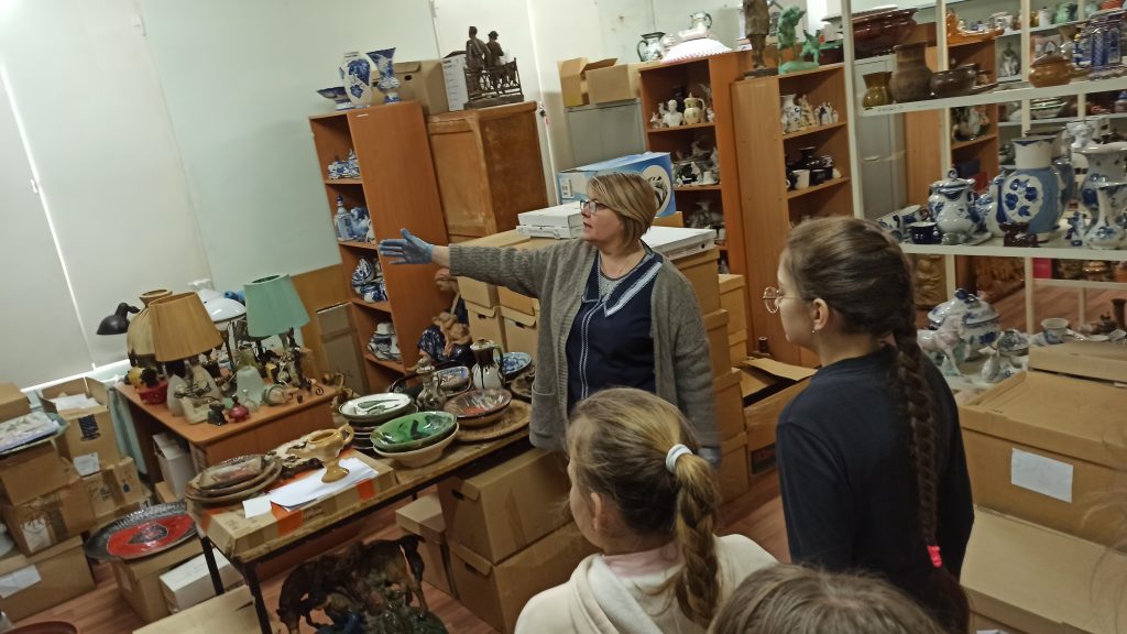 Ведущий методист Елена Покусаева рассказала детям историю создания и развития музейного дела, о том, как появляются и хранятся в музее экспонаты и как организуются выставки. «Мы никогда еще не рассказывали о музейной работе и не показывали, как хранятся его коллекции», — говорит она. Но на этот раз у ребят появилась такая возможность — посетить святая святых Раменского музея – фондохранилище. В сопровождении младшего научного сотрудника Елены Зайцевой, ученики побывали там, куда не пускают обычных посетителей, и увидели, как хранятся произведения искусства и исторически значимые предметы быта.