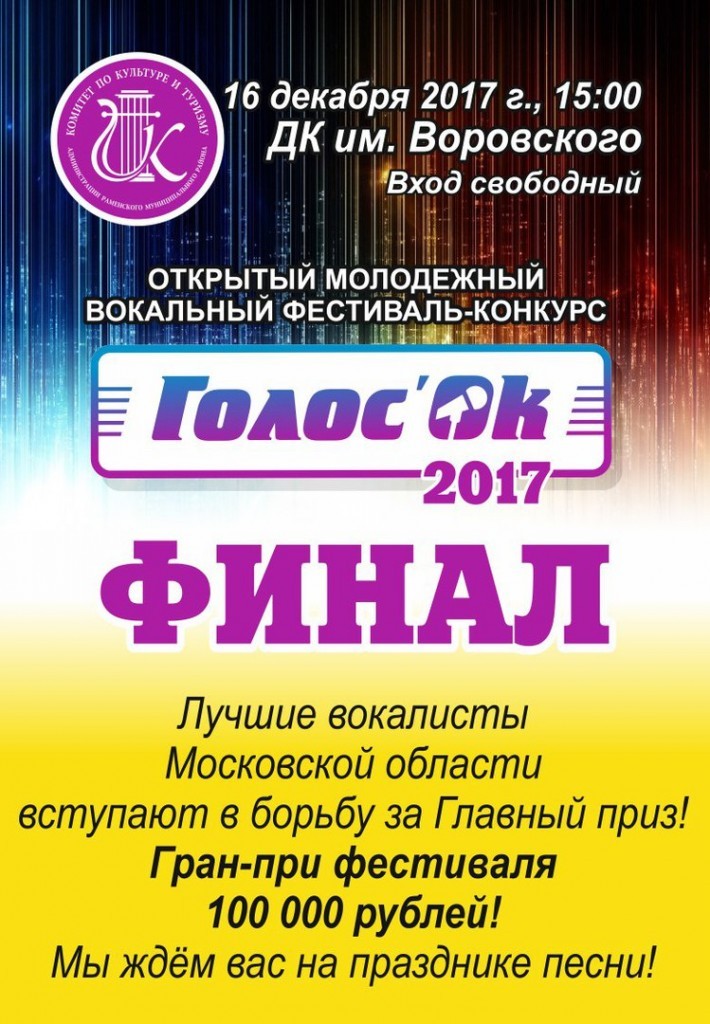 16 декабря в 15.00 «Раменское телевидение» начнет прямую трансляцию финала открытого молодежного фестиваля-конкурса «Голос’ОК». Параллельно с прямой трансляцией будет идти голосование, в котором смогут принять участие зрители, следящие за конкурсом как в зале, так и у экранов телевизора.