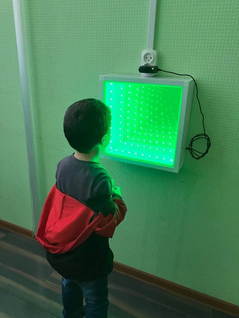 Занятия с ребятами проходят в сенсорной комнате. Специальное оборудование темной комнаты положительно влияет на эмоциональное состояние детей, снимает мышечное и психоэмоциональное напряжение, создает ощущение безопасности и защищенности, стимулирует мелкую моторику, активизирует речь. Такая волшебная комната является одним из важнейших средств коррекции и реабилитации.