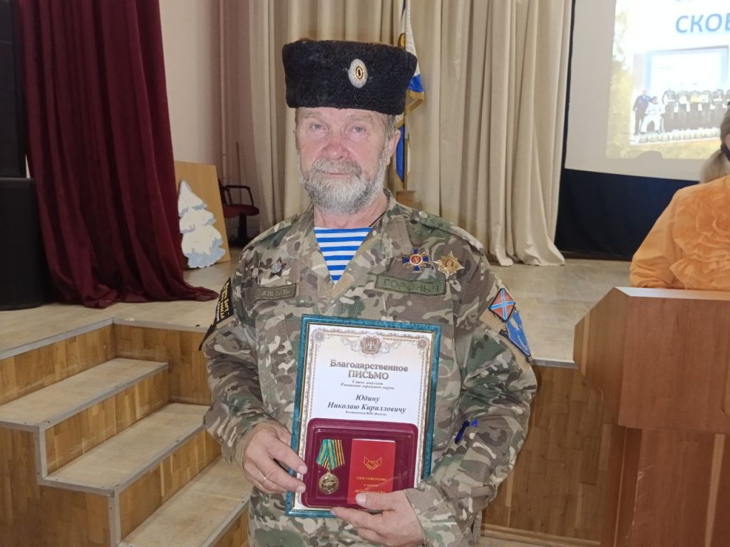 «У меня сегодня почетная миссия вручить награду одному из подвижников, преподавателей, наставников, который своим личным примером воодушевляет детей на дальнейшие победы. Это руководитель ВПК «Высота» и участник многих гуманитарных миссий на Донбасс Николай Кириллович Юдин», — отметила депутат Совета депутатов Раменского округа Татьяна Скочилова.