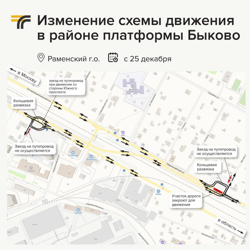 В соответствии с новой схемой ОДД, съезд/заезд на путепровод с прилегающей улично-дорожной сети в пос.Быково и Удельная будет осуществляться через кольцевые развязки на пересечении Южного проспекта и ул.Детской, а также ул.Леволинейной и ул.Лесной.