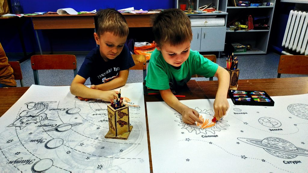 8 октября мальчики и девочки все вместе делали проект солнечной системы красками, карандашами, фломастерами и восковыми мелками.