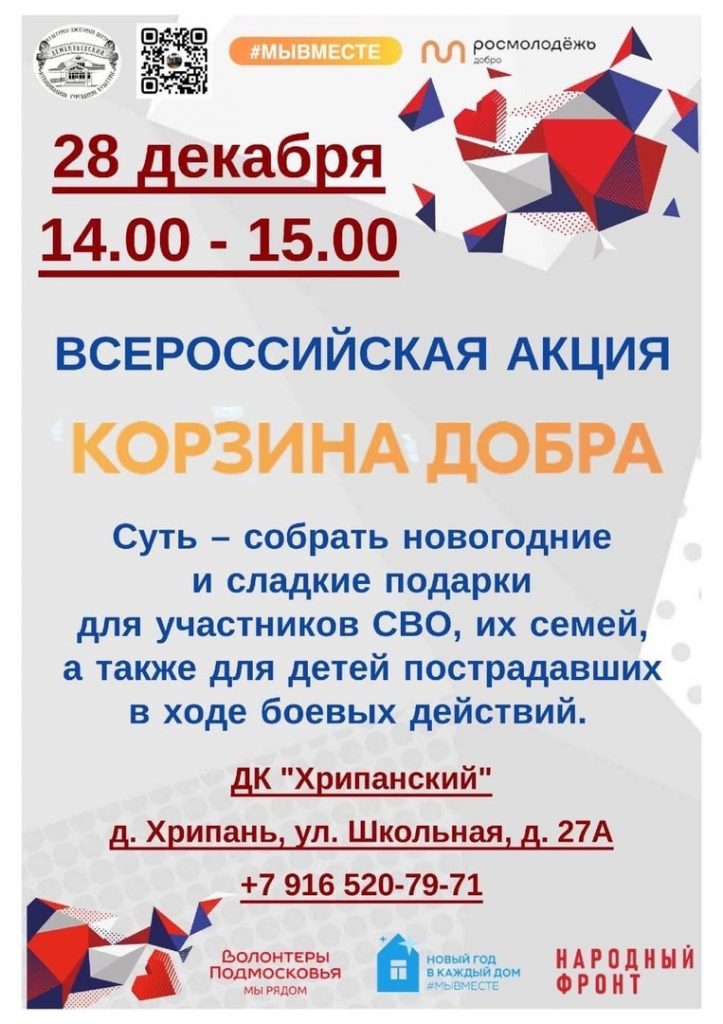 28 декабря с 14-00 до 15-00 в ДК «Хрипанский» пройдет сбор новогодних и сладких подарков для участников специальной военной операции, а также детей пострадавших в ходе боевых действий.