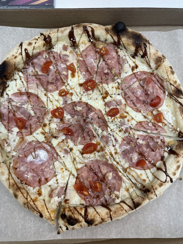 Не забываем про начинку и ставим пиццу в печь. Надежда поделилась: «Мы выпекаем пиццу в подовой печи. Конечно, в идеале делать это в дровяной, это совершенно другое качество продукта и визуал пиццы, но что имеем, то имеем. Выставляется температура на 380-420 градусов для классической пиццы. Точная температура зависит от степени гидратации теста».