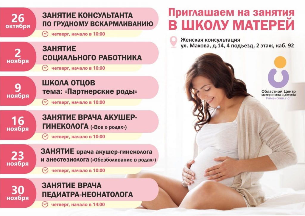 Очные занятия проходят 1 раз в неделю по четвергам в женской консультации по адресу: ул. Махова, д.14, 4 подъезд, 2 этаж, каб. 92.