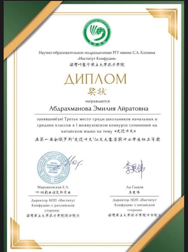 Ученица 5 «А» класса Ильинской школы №26 Абдрахманова Эмилия заняла Третье место среди школьников начальных и средних классов в I межвузовском конкурсе сочинений на китайском языке на тему «Путь к китайскому языку».