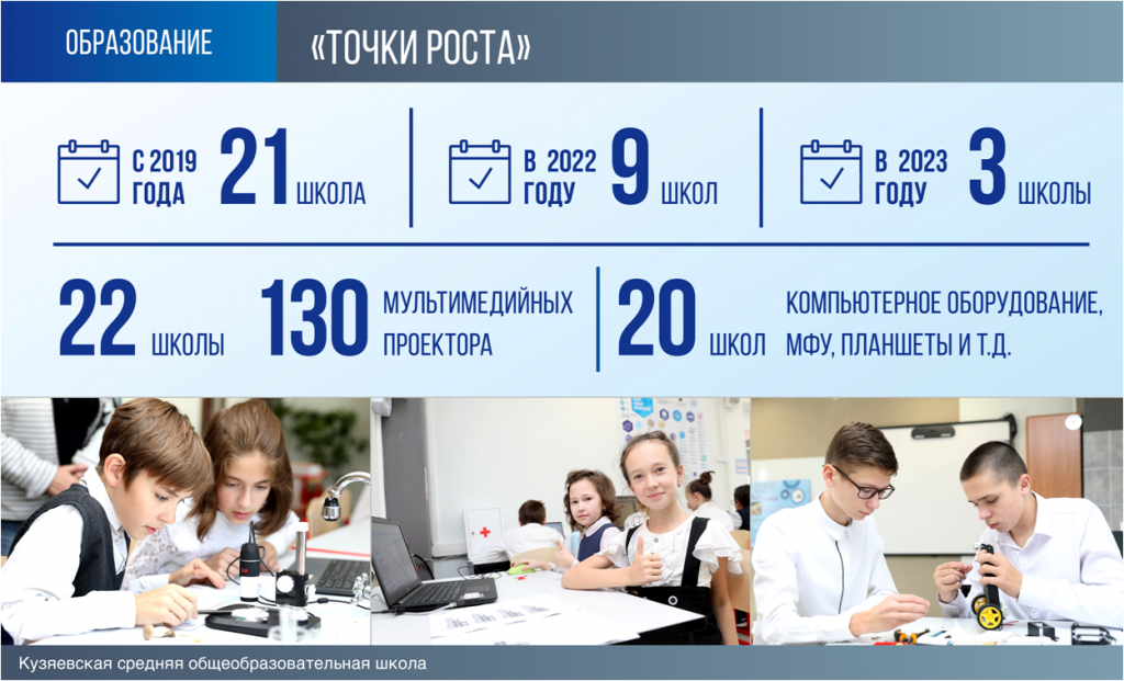 В 2022 году создано 9 центров «Точка роста», 22 школы получили 130 мультимедийных проекторов, 20 школ оснастили компьютерами.
