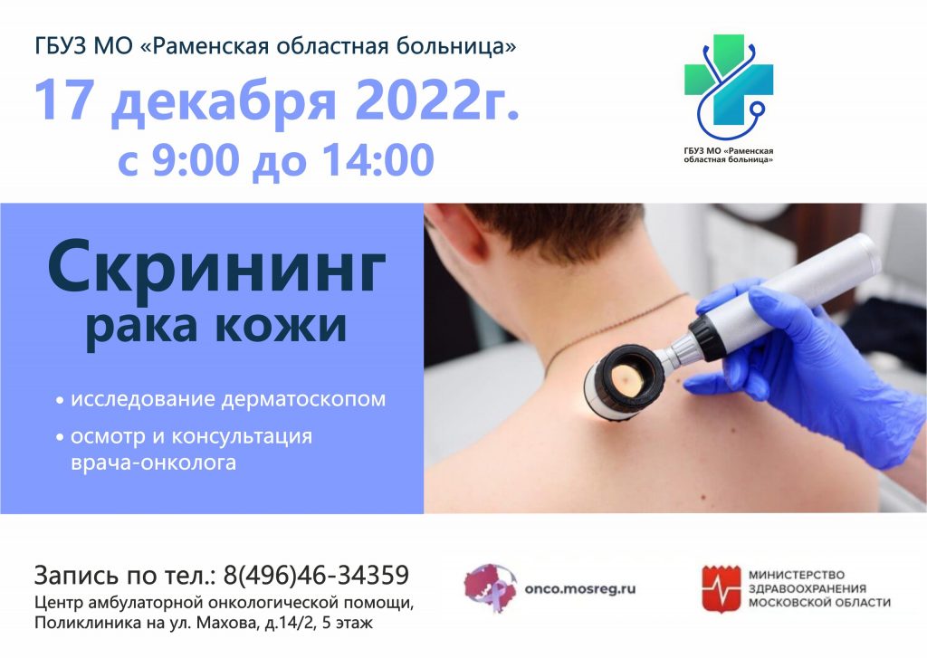 В субботу, 17 декабря 2022г. с 9:00 до 14:00 в Центре амбулаторной онкологической помощи Раменской областной больницы пройдет День открытых дверей с целью выявления злокачественных новообразований на коже.