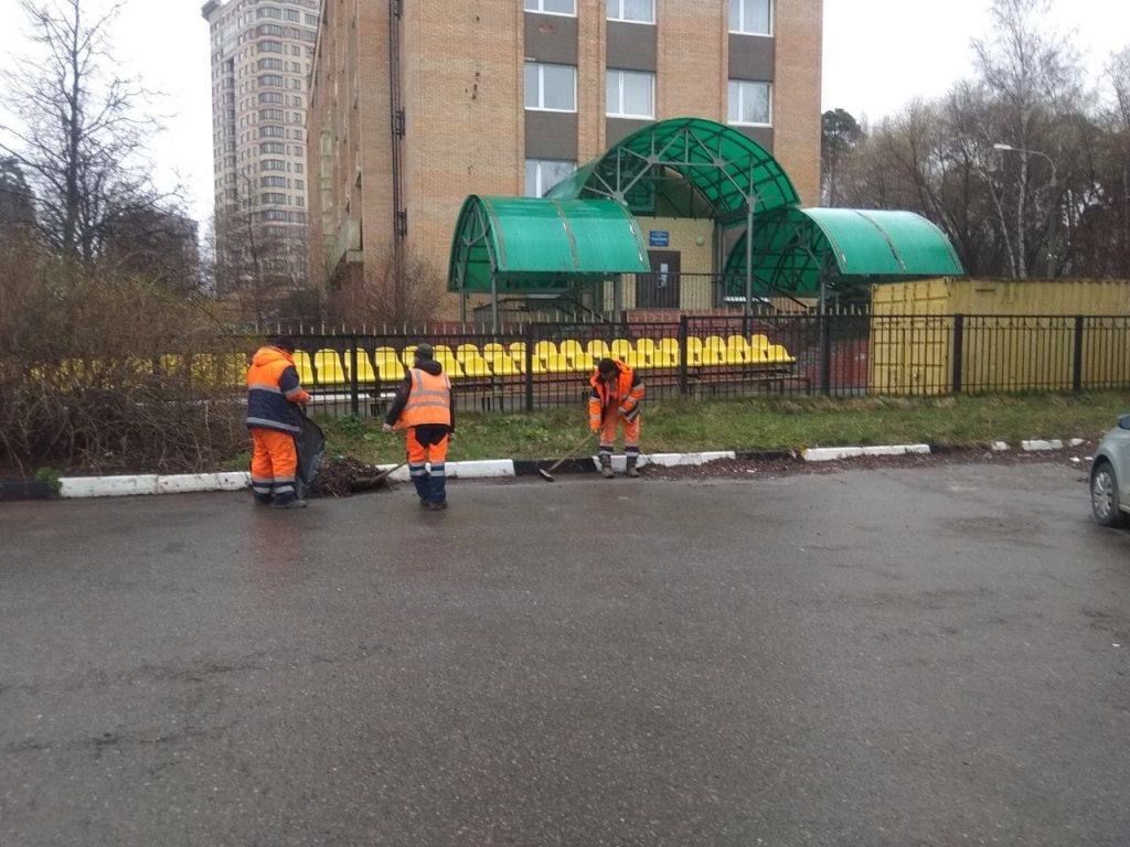 Вручную выполняется уборка прибордюрных участков дорожного полотна.