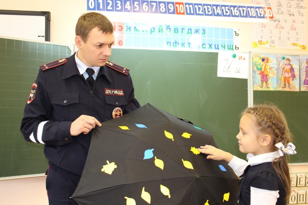 В рамках школьного урока, вместе с инспектором ДПС отдела ГИБДД «Раменское» лейтенантом полиции Сергеем Кобзевым, ребята украсили зонтики и дождевики яркими светоотражающими листочками, которые подготовили собственными руками.