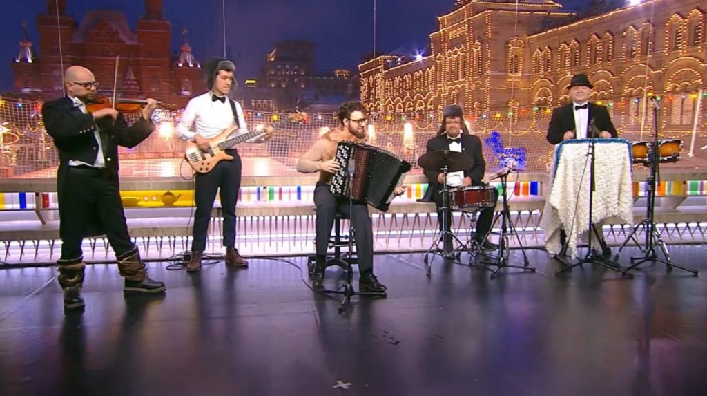 Музыканты сыграли мелодию советской эстрадной песни «Увезу тебя я в тундру». Аранжировка и выступление получились яркими и необычными, что отметили даже ведущие программы. В знакомой мелодии слились скрипка, баян, бас-гитара, бонги, коробочка и бубен. В конце музыканты хором исполнили строчку из припева.