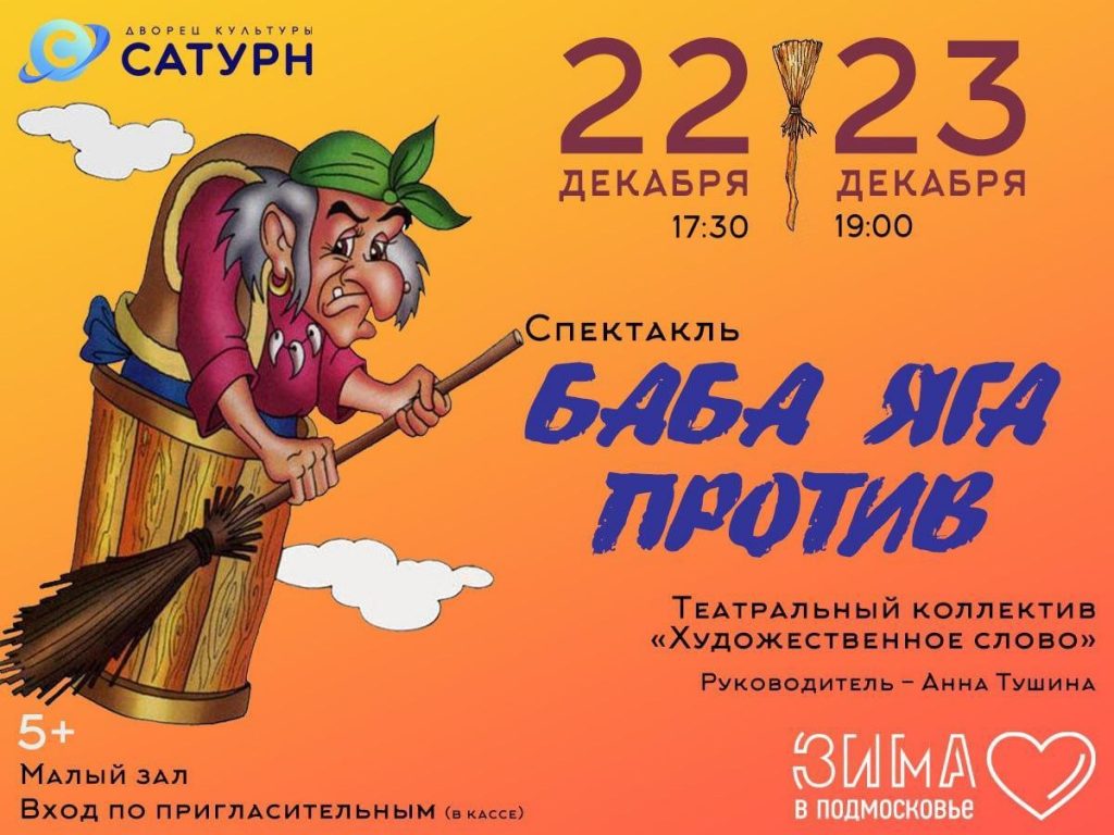 22 и 23 декабря театральный коллектив «Художественное слово» Дворца культуры «Сатурн» приглашает Вас на спектакль «Баба Яга против».