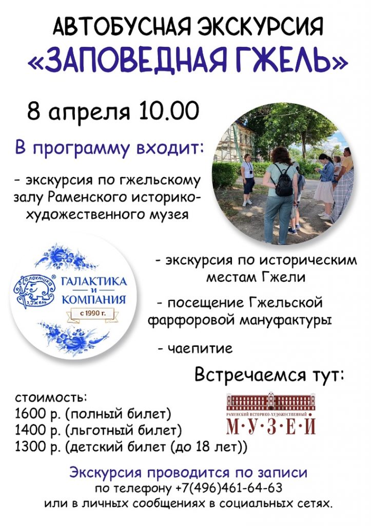 «Увидеть подлинные шедевры гжельского искусства в Раменском музее, посетить настоящее гжельское производство и заводской музей, пройтись по историческим местам Гжели в сопровождении эксперта по гжельскому промыслу, сотрудника ТИЦ «Раменское» Ольги Семерицкой и, конечно, погрузиться в историю старинного гжельского промысла – всё это предлагает вам наш новый экскурсионный маршрут», – сообщили они.