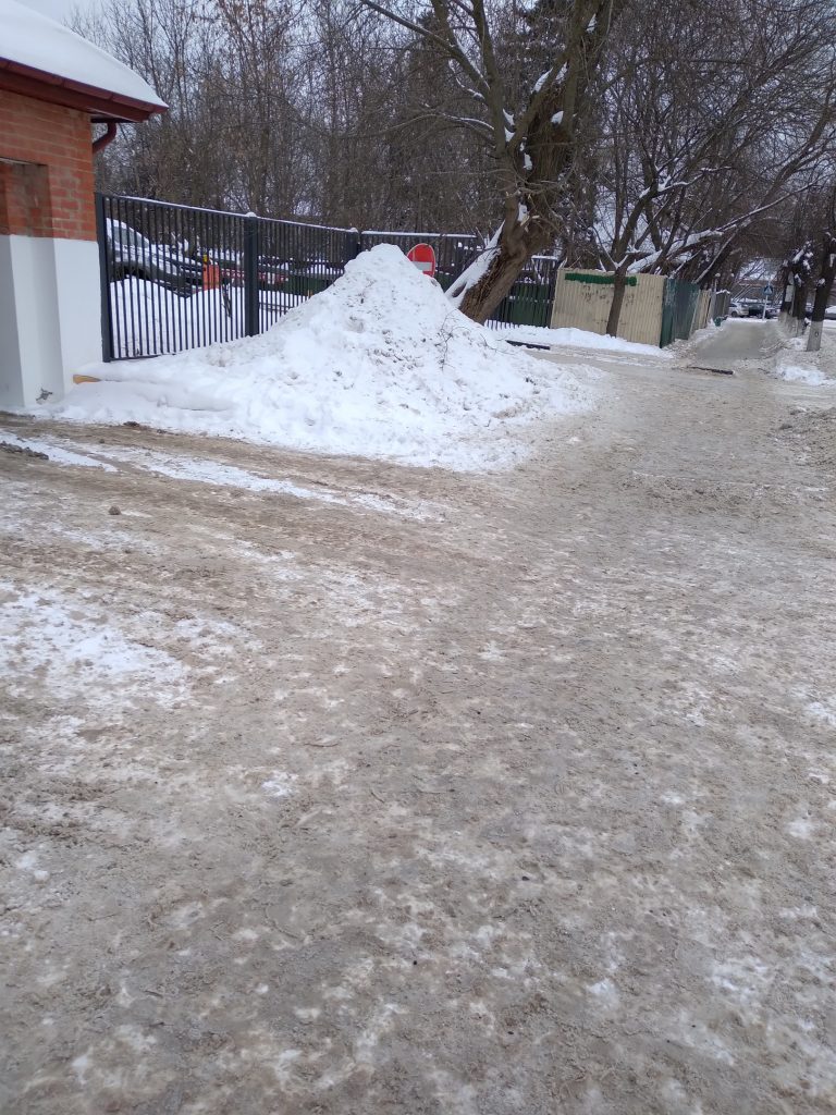 Благоустроенный двор прилежно убран, а снежный «террикон» ждет технику для вывоза снега.