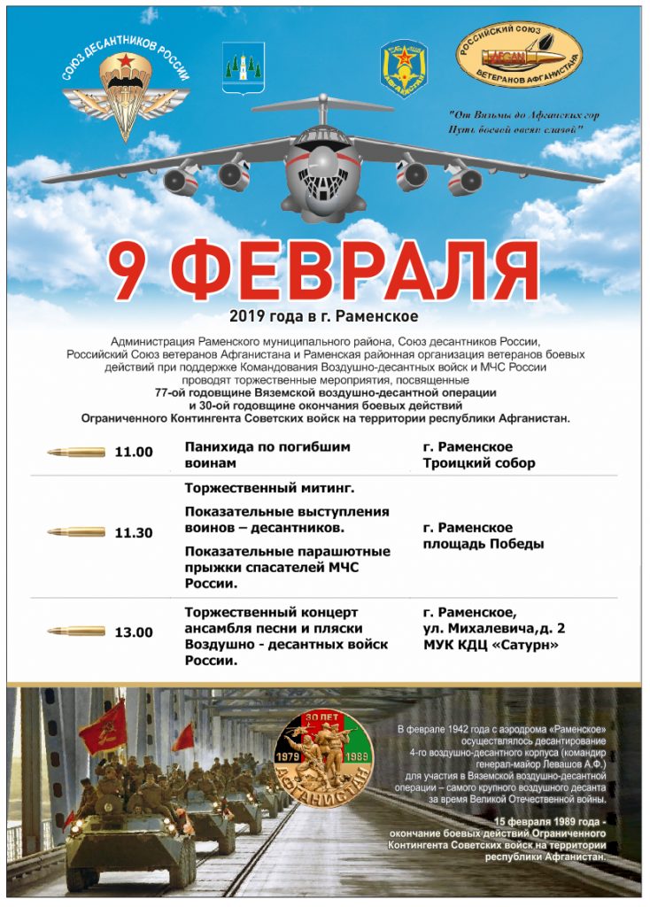Под эгидой Союза десантников России, Администрации Раменского района, 56 ДШБ и Российского Союза Ветеранов Афганистана 9 февраля в г.Раменское состоятся торжественные мероприятия, посвященные двум событиям военной истории нашей страны: 77-й годовщине Вяземской воздушно-десантной операции в годы Великой Отечественной войны и 30-й годовщине окончания боевых действий в Республике Афганистан и выводу с территории Афганистана Ограниченного контингента советских войск.