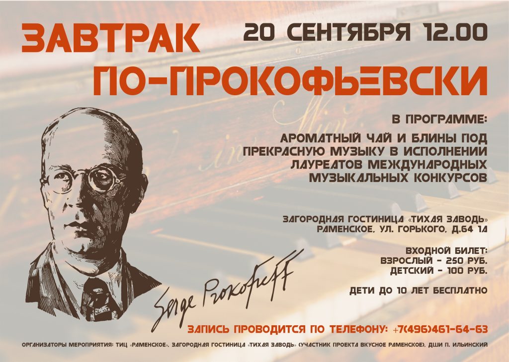 20 сентября в дачном поселке Кратово вновь состоится долгожданный «Завтрак по-Прокофьевски» — музыкально-литературная встреча, повествующая о жизни и творчестве Сергея Сергеевича Прокофьева, который любил проводить свободное время на даче в Кратово, где он искал вдохновения. Именно здесь, в Кратово, в 1941г. он работал над балетом «Золушка», когда его застала новость о начавшейся войне. Приглашаем окунуться в атмосферу дачной жизни русской интеллигенции середины XX века в стенах загородной гостиницы «Тихая заводь» — участницы гастрономического проекта «Вкусное Раменское» (подробности в афише)