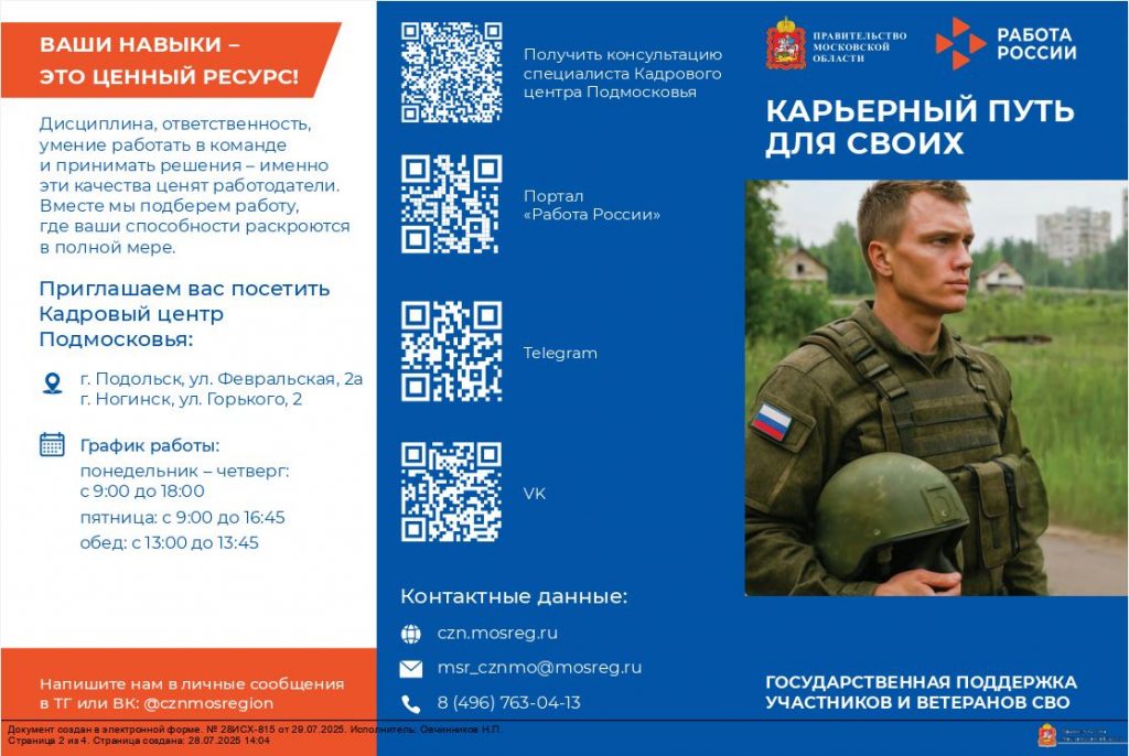 Подробную информацию можно получить:Кадровый центр Подмосковья