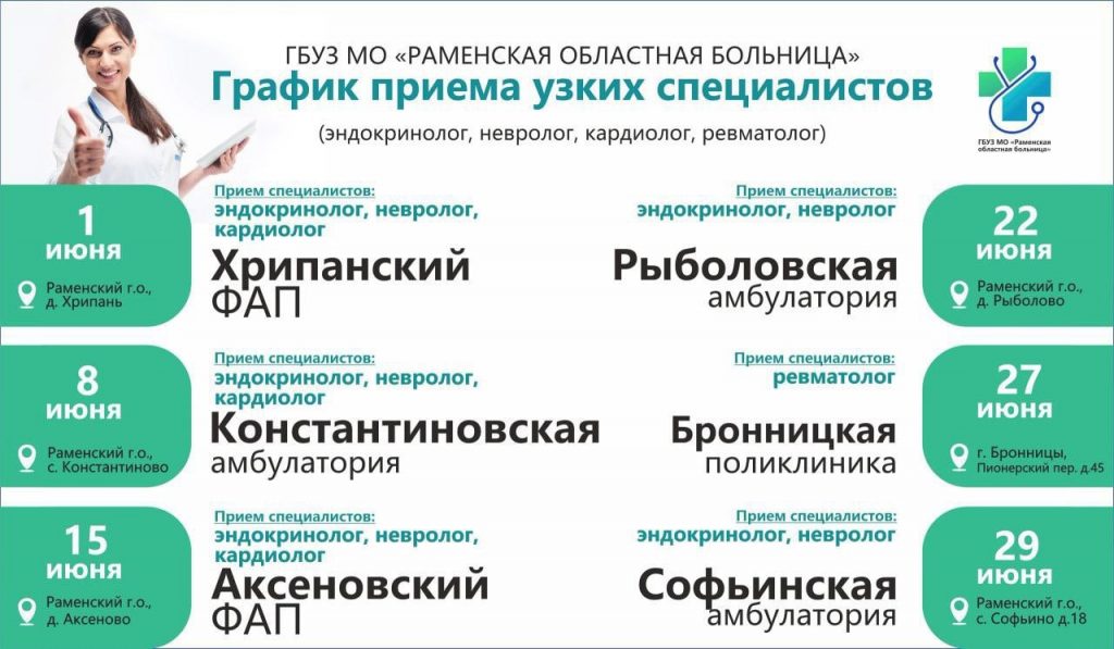 25 июля в Бронницкой поликлинике пройдет прием врача-ревматолога по адресу: г. Бронницы, Пионерский переулок, д. 45.