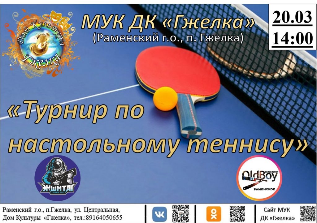 ДК «Гжелка» ТУ Сафоновское 20 марта состоится турнир по настольному теннису. Начало в 14-00.