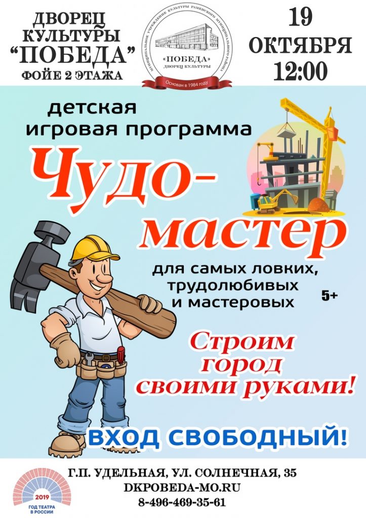 В ДК «Победа» 19 октября приглашает маленьких гостей и их родителей на строительную игровую программу «Чудо-мастер».