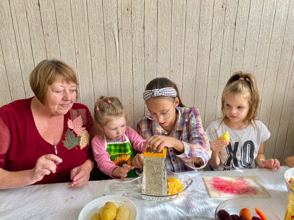 Опытные цветоводы раскрыли свои секреты выращивания на приусадебном участке цветущего сада и цветов. На мероприятие пришли бабушки, мамы и дети. Осень — это пора урожая, ягодных пирогов и овощных салатов. Поэтому и мы решили вместе с ребятами приготовить из полезных овощей вкусный винегрет и рыбу под шубой. Каждый выбирал себе овощи по вкусу, клал на свою разделочную доску и старался аккуратно нарезать.