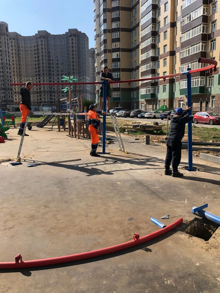 На данный момент подготовлены основания для будущей площадки, завезены игровые элементы, ведется установка. Также дополнительно подготовлены для высадки зеленые насаждения, которые будут украшать новое благоустроенное пространство.