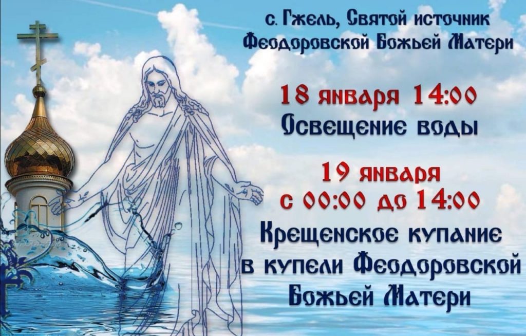 В селе Гжель на Святом источнике Феодоровской Божьей Матери 18 января в 14.00 состоится Освещение воды, а 19 января с 00.00 до 14.00 часов пройдет Крещенское купание в купели Святого источника.