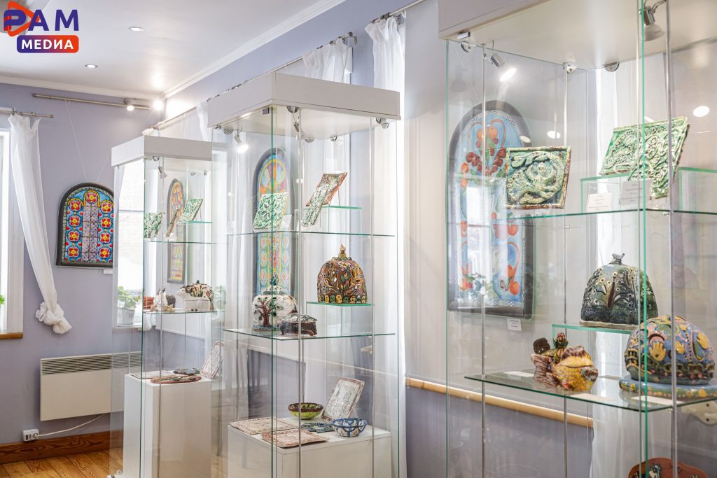 Помимо живописных полотен, особое место на выставке занимают керамические изделия, шкатулки, игрушки и светильники.
