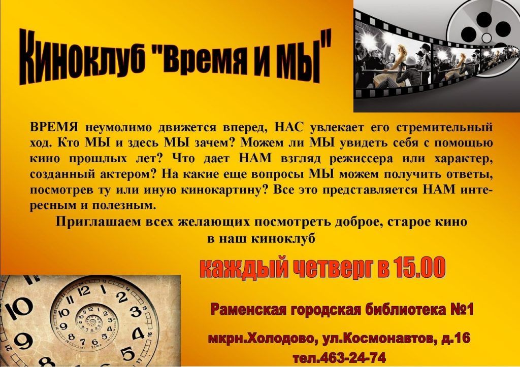 Собрание киноклуба и показ фильмов проходят каждый четверг в 15.00. Приглашаются все любители кино!