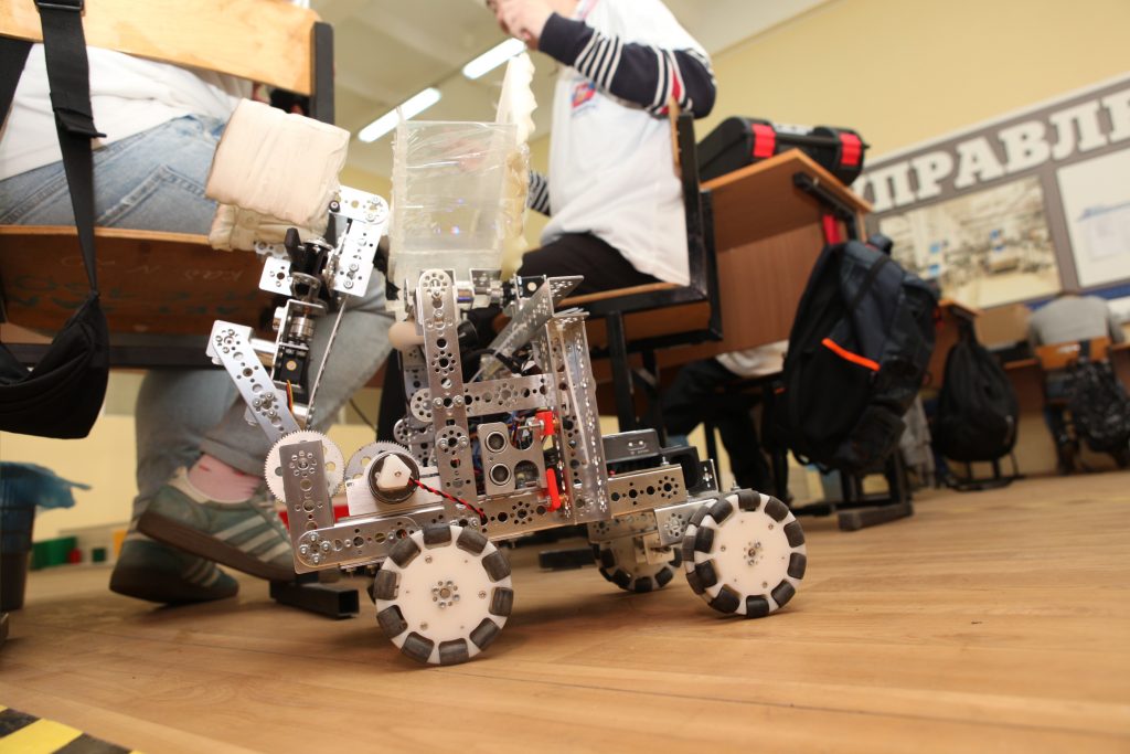 В лаборатории Мобильной робототехники участники соревнований из-под ручных материалов собирают робота, программируют его с задачей: собрать мусор и положить его в нужный контейнер. При этом, роботы должны по отсекам двигаться по выбранной траектории, соблюдая правила дорожного движения, учитывая все сигналы светофора.