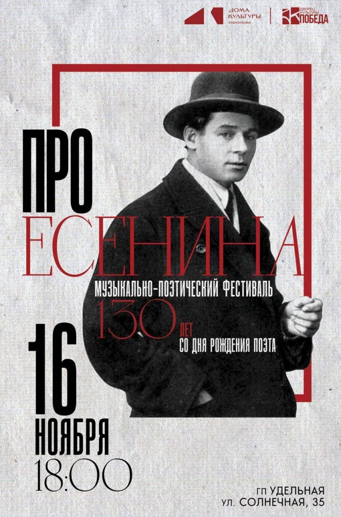 16 ноября в 18:00 в ДК «Победа» состоится музыкально-поэтический фестиваль «ПРОЕсенина». Мероприятие будет посвящено творчеству великого русского поэта Сергея Александровича Есенина.