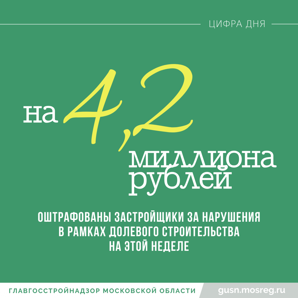 «Главгосстройнадзором 18 февраля по итогам рассмотрения дел об административных правонарушениях в части долевого строительства многоквартирных домов и иных объектов недвижимости на территории Московской области были вынесены постановления о наложении штрафных санкций на застройщиков на сумму 4 млн. 265 тыс. рублей», – отметил начальник Главного управления государственного строительного надзора Московской области Артур Гарибян.