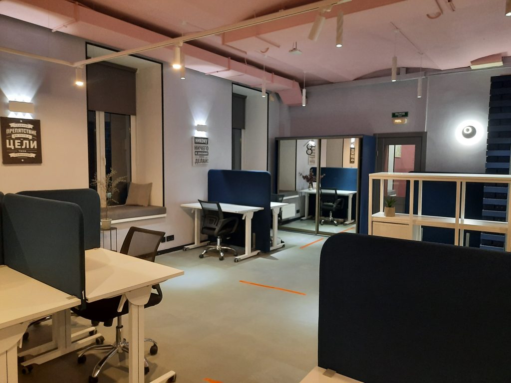 Коворкинг-центр создан с учетом всех ограничений, которые действуют в связи с коронавирусом: есть перегородки между рабочими местами, вся мебель эргономична и легко передвигается, есть возможность увеличивать пространство между резидентами.
