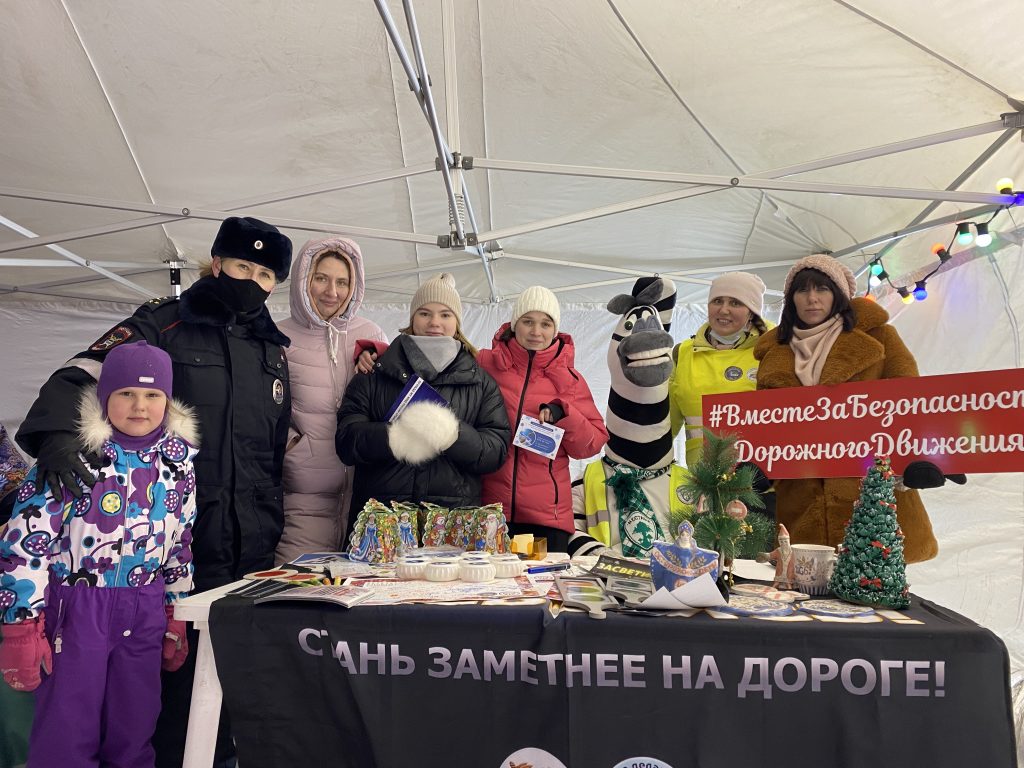 На центральной городской площади госавтоинспекторы совместно с представителями комиссии по делам несовершеннолетних, общественной организации и волонтёрами традиционно приняли участие в благотворительной «Ярмарке добра».Организаторы максимально постарались зарядить праздничным настроением детей и взрослых.Сотрудники полиции провели для гостей тематические мастер — классы по изготовлению оригинальных новогодних подарков из световозвращающей бумаги, конкурсы и викторины, предложили написать новогодние поздравления для участников дорожного движения. В качестве призов вручали сигнальные жилеты, световозвращатели, сладкие призы, тематические пазлы, а так же тематические украшения и елочные игрушки изготовленные из керамики школьниками. Зажигательным флеш-мобом полицейские призвали присутствующих соблюдать дорожные правила, использовать световозвращатели, быть яркими и заметными на проезжей части.