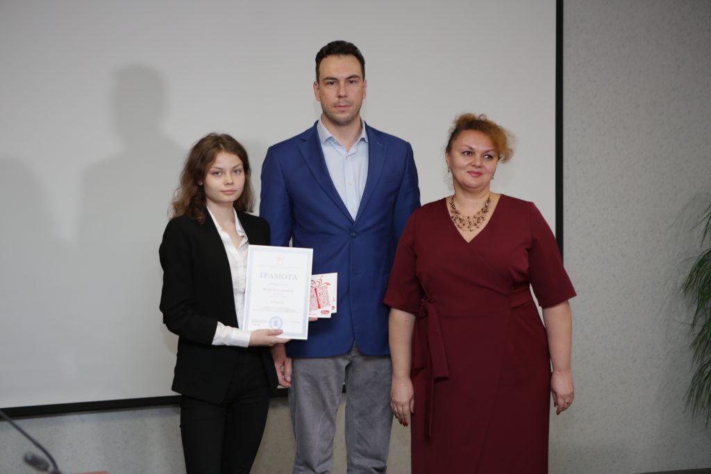 Девушке вручи грамоту от Министерства инвестиций, промышленности и науки Московской области и сертификат на покупку в магазин электроники.